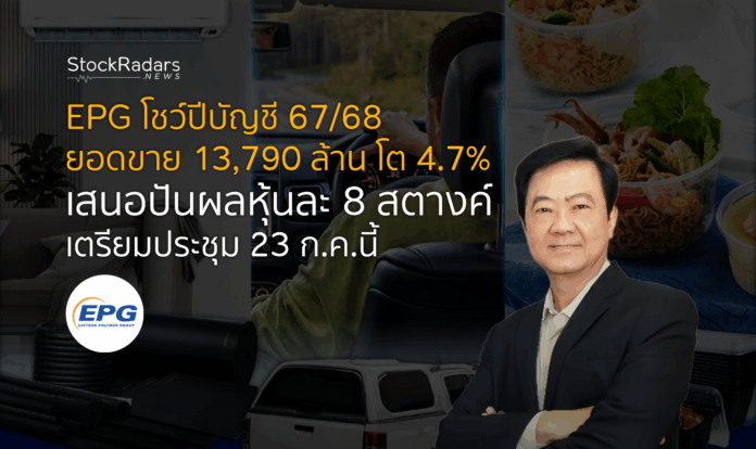 EPG เผยผลการดำเนินงานปีบัญชี 2567/68 (เม.ย. 67 – มี.ค. 68) มียอดขายรวม 13,790 ล้านบาท เติบโต 4.7% จากปีก่อน แม้กำไรสุทธิลดลงเหลือ 808 ล้านบาท จากปัจจัยกดดันด้านอัตราแลกเปลี่ยนและการตั้งสำรองลูกหนี้ อย่างไรก็ตาม ที่ประชุมบอร์ดมีมติเสนอจ่ายเงินปันผลให้ผู้ถือหุ้นอีก 0.08 บาทต่อหุ้น รวมจ่ายทั้งปี 0.14 บาทต่อหุ้น คิดเป็น 48.5% ของกำไรสุทธิ พร้อมกำหนดประชุมสามัญผู้ถือหุ้นในวันที่ 23 กรกฎาคมนี้ เพื่อพิจารณาอนุมัติการจ่ายปันผลดังกล่าว