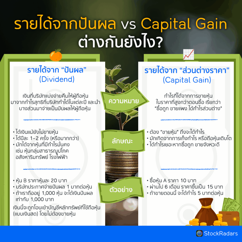 📈 รายได้จาก “ส่วนต่างราคา” (Capital Gain) คือ กำไรที่ได้จากการขายหุ้นในราคาที่สูงกว่าตอนซื้อ เรียกว่า “ซื้อถูก ขายแพง ได้กำไรส่วนต่าง”