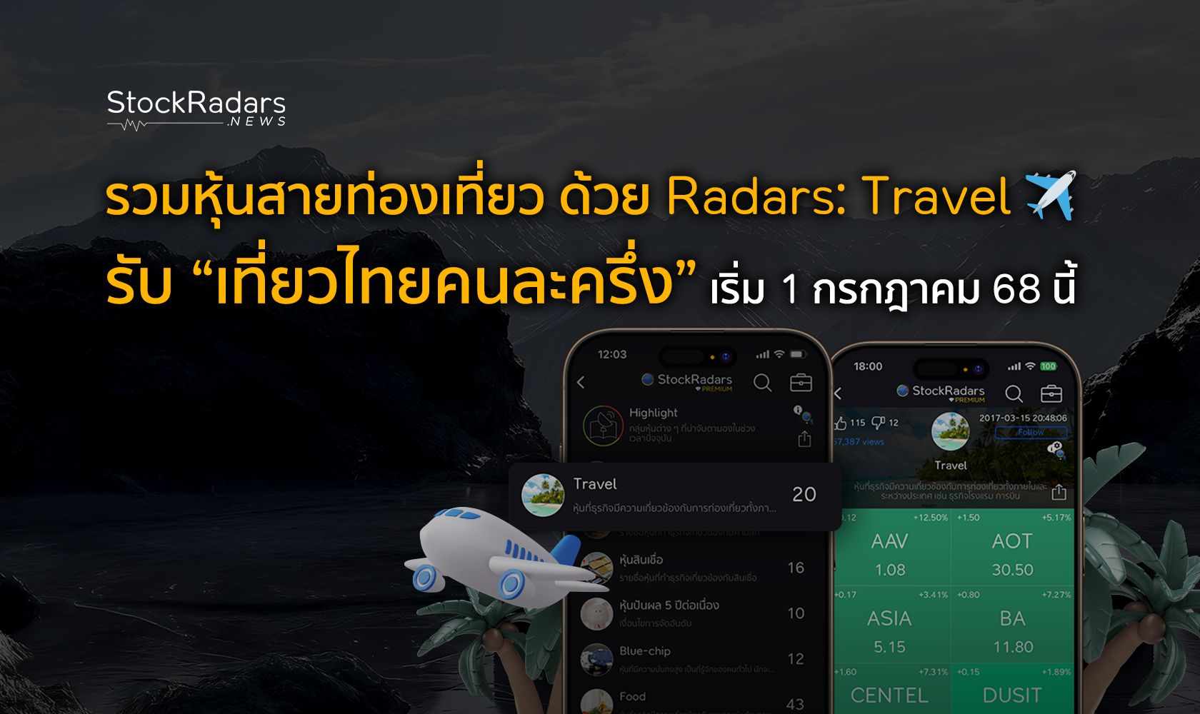 ใน StockRadars เรามี 💡 Radars: Travel ที่รวมหุ้นที่เกี่ยวข้องกับการท่องเที่ยวทั้งในและต่างประเทศไว้ให้แล้ว เช่น AAV, AOT, ASIA, BA, CENTEL, DUSIT, ERW, GRAND และอื่น ๆ อีกมากมาย โดยสามารถเลือกดูได้ใน Radars > Highlight Radars และเลื่อนลงมาที่ Travel เพื่อดูข้อมูลแต่ละหุ้นทั้งหมดในกลุ่มนี้เพิ่มเติมได้บนแอปฯ StockRadars