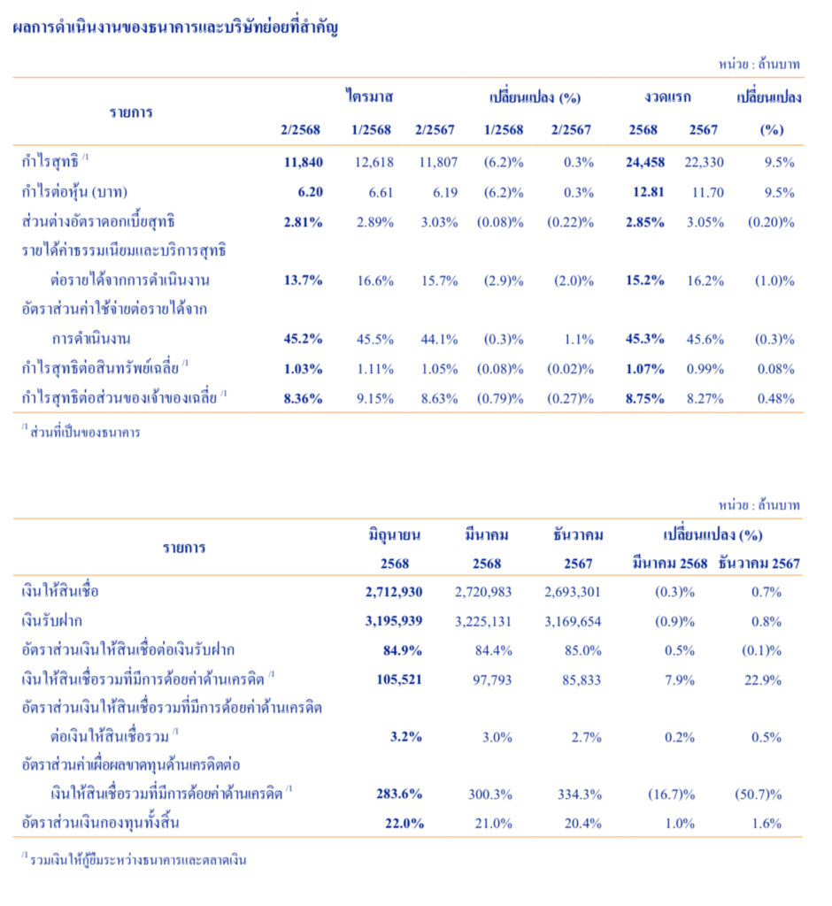 นอกจากนี้ ณ สิ้นเดือนมิถุนายน 2568 ธนาคารมีเงินให้สินเชื่อจำนวน 2,712,930 ล้านบาท เพิ่มขึ้นร้อยละ 0.7 จากสิ้นปีก่อน ส่วนใหญ่จากสินเชื่อลูกค้าธุรกิจรายใหญ่ สำหรับอัตราส่วนเงินให้สินเชื่อที่มีการด้อยค่าด้านเครดิตต่อเงินให้สินเชื่อรวมอยู่ที่ร้อยละ 3.2 ซึ่งอยู่ในระดับที่บริหารจัดการได้ โดยมีอัตราส่วนค่าเผื่อผลขาดทุนด้านเครดิตต่อเงินให้สินเชื่อที่มีการด้อยค่าด้านเครดิตอยู่ในระดับแข็งแกร่งที่ร้อยละ 283.6 เป็นผลจากการที่ธนาคารยึดหลักการตั้งสำรองด้วยความระมัดระวังและรอบคอบอย่างต่อเนื่อง