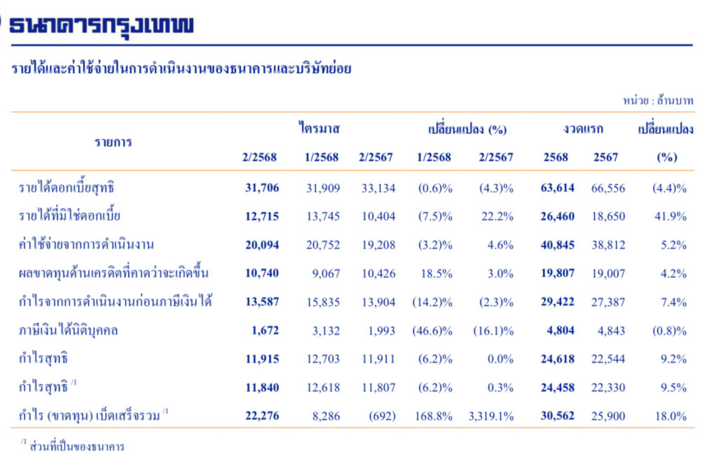 ธนาคารกรุงเทพและบริษัทย่อยรายงานกำไรสุทธิสำหรับงวดแรกปี 2568 จำนวน 24,458 ล้านบาท เพิ่มขึ้นร้อยละ 9.5 จากงวดแรกปีก่อน สะท้อนถึงความสามารถในการบริหารสินทรัพย์ท่ามกลางความท้าทายทางเศรษฐกิจหลายด้าน ธนาคารมีรายได้ดอกเบี้ยสุทธิจำนวน 63,614 ล้านบาท และส่วนต่างอัตราดอกเบี้ยสุทธิร้อยละ 2.85 ซึ่งเป็นไปตามทิศทางอัตราดอกเบี้ย สำหรับรายได้ที่มิใช่ดอกเบี้ยเพิ่มขึ้นจากกำไรสุทธิจากเครื่องมือทางการเงินที่วัดมูลค่าด้วยมูลค่ายุติธรรมผ่านกำไรหรือขาดทุน และกำไรจากเงินลงทุน ขณะที่รายได้ค่าธรรมเนียมและบริการสุทธิลดลงส่วนใหญ่จากการบริการธุรกรรมผ่านธนาคาร สุทธิกับรายได้จากบริการการค้าระหว่างประเทศที่เพิ่มขึ้น