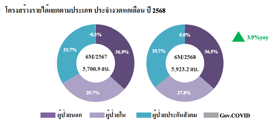 กำไรสุทธิไตรมาส 2/68 อยู่ที่ 388.2 ล้านบาท เพิ่มขึ้น 40.1% จากปีก่อน คิดเป็นอัตรากำไรสุทธิ 12.7% โดยมีปัจจัยหนุนจากรายได้ผู้ป่วยโครงการประกันสังคมและการรักษาโรคเรื้อรังจำนวน 60 ล้านบาท