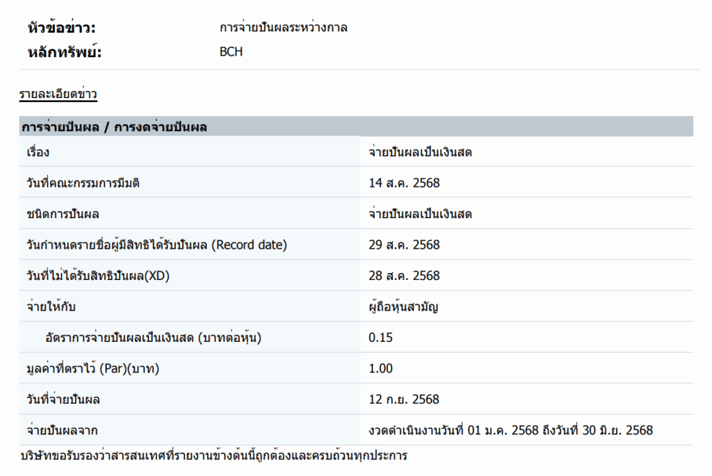 ส่งผลให้คณะกรรมการบริษัทมีมติจ่ายปันผลระหว่างกาลในอัตรา 0.15 บาทต่อหุ้น รวมเป็นเงิน 374.1 ล้านบาท กำหนดขึ้นเครื่องหมาย XD วันที่ 28 สิงหาคม 2568 และจ่ายเงินปันผลในวันที่ 12 กันยายน 2568
