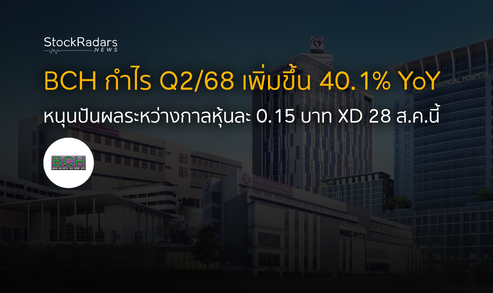 BCH โชว์ผลงานไตรมาส 2/68 กำไรสุทธิเพิ่ม 40.1% แตะ 388.2 ล้านบาท รับอานิสงส์รายได้จากผู้ป่วยโครงการประกันสังคมและการรักษาโรคเรื้อรัง หนุนรายได้รวมเพิ่มขึ้น 5.7% สู่ระดับ 3,045 ล้านบาท พร้อมประกาศจ่ายปันผลระหว่างกาล 0.15 บาทต่อหุ้น กำหนด XD วันที่ 28 สิงหาคม 2568 และจ่าย 12 กันยายน 2568