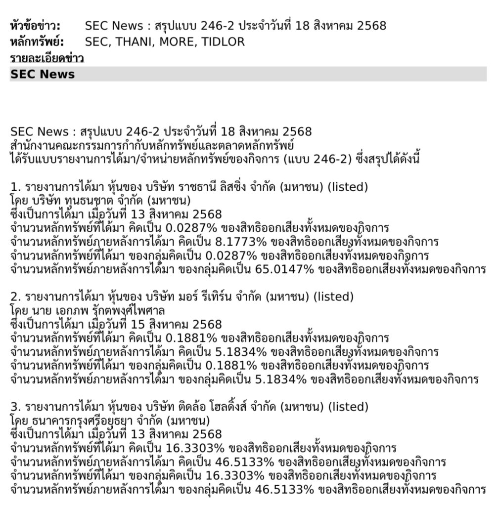 สำนักงานคณะกรรมการกำกับหลักทรัพย์และตลาดหลักทรัพย์ (ก.ล.ต.) เปิดเผยรายงานการได้มา/จำหน่ายหลักทรัพย์ของกิจการ (แบบ 246-2) เมื่อวันที่ 18 สิงหาคม 2568