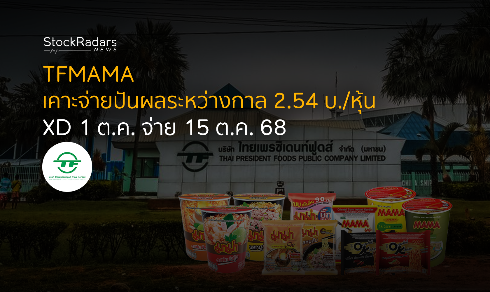 บริษัท ไทยเพรซิเดนท์ฟูดส์ จำกัด (มหาชน) หรือ TFMAMA ประกาศจ่ายเงินปันผลระหว่างกาลจากผลการดำเนินงานครึ่งแรกปี 2568 รวมทั้งสิ้น 2.54 บาทต่อหุ้น แบ่งเป็นจากกำไรสุทธิส่วนที่ไม่ได้รับการส่งเสริม BOI จำนวน 2.39 บาทต่อหุ้น และจากกำไรสุทธิส่วนที่ได้รับการส่งเสริม BOI จำนวน 0.15 บาทต่อหุ้น กำหนดขึ้นเครื่องหมาย XD วันที่ 1 ตุลาคม 2568 และจ่ายเงินปันผลให้ผู้ถือหุ้นในวันที่ 15 ตุลาคม 2568
