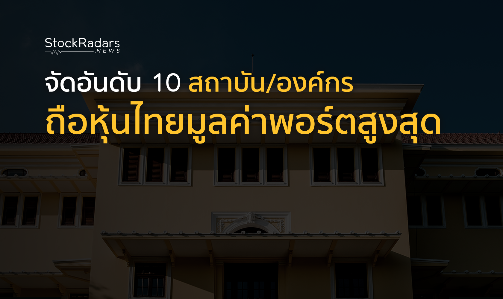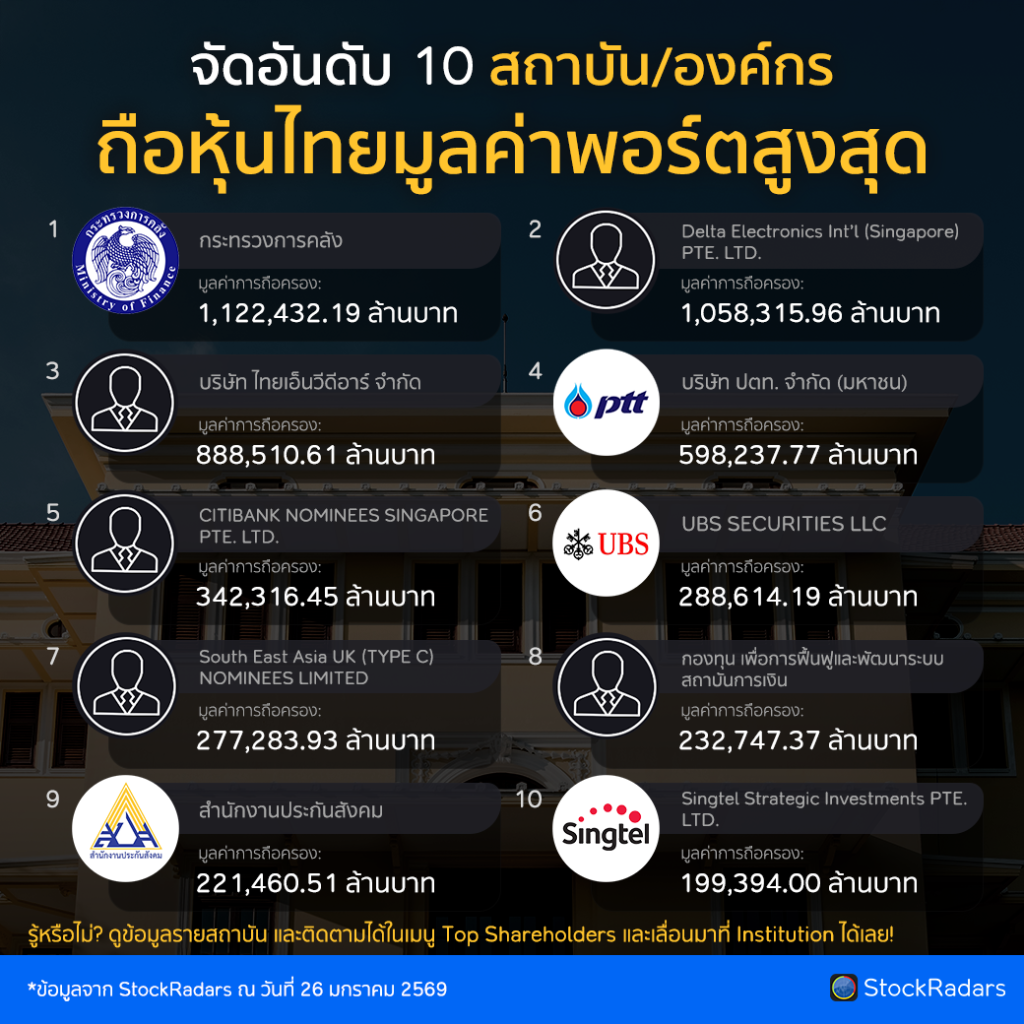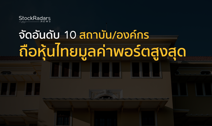 ล่าสุดในฟีเจอร์ “Top Shareholders (Institution)” จาก StockRadars มีการจัดอันดับ 10 สถาบัน/องค์กร/หน่วยงานรัฐที่ถือหุ้นมูลค่าสูงสุด ดังนี้