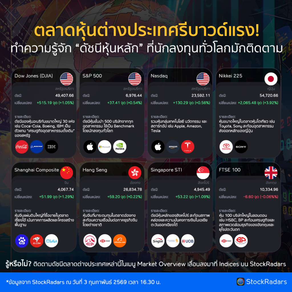 วันนี้มาทำความรู้จักกับ ดัชนีหุ้นสำคัญระดับโลก ที่นักลงทุนทั่วโลกใช้ติดตามทิศทางของเศรษฐกิจและตลาดการเงิน อัปเดตข้อมูลล่าสุดจากแอป StockRadars วันที่ 3 กุมภาพันธ์ 2569
