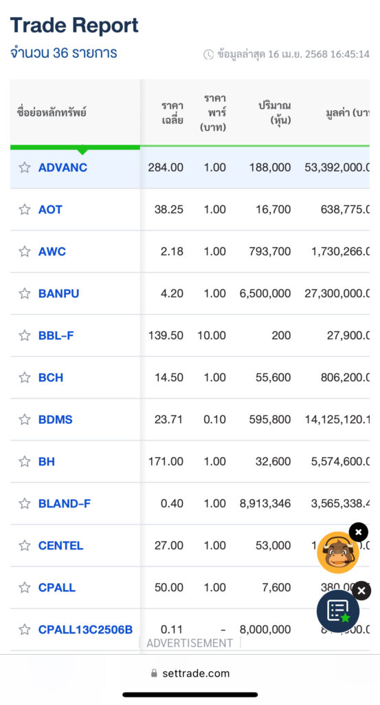 ล่าสุด (16 เมษายน 2568 ณ เวลา 16.45 น.) ตลาดหลักทรัพย์ฯ รายงานการซื้อขายรายการใหญ่ (Big Lot) ของหุ้นบริษัท แอดวานซ์ อินโฟร์ เซอร์วิส จำกัด (มหาชน) หรือ ADVANC จำนวน 188,000 หุ้น ที่ราคาเฉลี่ย 284.00 บาทต่อหุ้น รวมมูลค่ากว่า 53,392,000 บาท